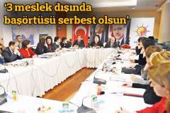 AK Parti'li kadınlar yeni anayasada kamuda eşitlik istedi: `Polis, öğretmen ve yargıç dışında başörtüsü serbest olmalı.` AK Parti Kadın Kolları geçen ay genel merkezde kadınların sorunları ile ilgili çalıştay yaptı.