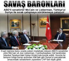 ABD’li senatörler McCain ve Lieberman, Türkiye’yi Suriye ile sıcak çatışmaya sürüklemeye çalışıyor. Önce tampon bölge sonra parçalamak Esad rejimine karşı ısrarla askeri müdahale isteyen ABD’li senatörler John McCain ve Joe Lieberman, Cumhurbaşkanı Gül tarafından İstanbul Tarabya’daki Huber Köşkü’nde konuk edildi.