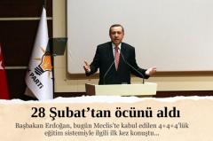 Başbakan Erdoğan, 4+4+4 teklifinin TBMM'den geçmesine ilişkin olarak 'Bugün bir kez daha tarih yazdınız. Demokratik tarihimize kara bir leke olarak kazınmış 28 Şubat'ın son izini tarihin tozlu raflarına gönderdik' dedi.