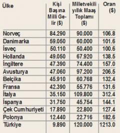 Dünya Bankası’nın en son raporundaki ülkelerin 2010 yılı kişi başına milli gelir rakamlarını esas aldım. İnternette de Yılmaz Dağdeviren’in çeşitli Avrupa ülkelerindeki milletvekili maaşları ile ilgili araştırmasını buldum. Rakamlar yan yana getirildiğinde şu çarpıcı tablo ortaya çıkıyor: